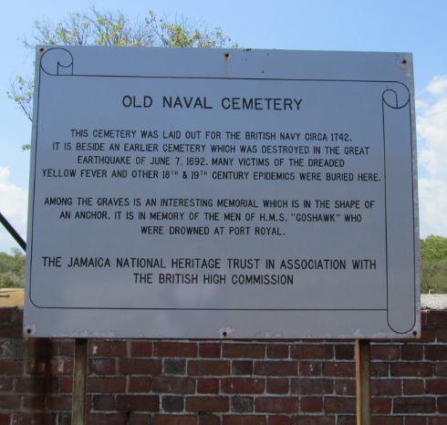 This Cemetery was laid out for the British Navy Circa 1742.  It is beside an earlier cemetery which was destroyed in the Great Earthquake of June 7, 1692.  Many victims of the dreaded yellow fever and other 18th & 19th century epidemics were buried here. Among the graves is an interesting memorial, which is in the shape of an anchor.  It is in memory of the men of H.M.S. “Goshawk” who were drowned at Port Royal.