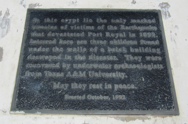 Crypt, Pt RoyalIn this crypt lie the only marked remains of victims of the Earthquake that destroyed Port Royal in 1692.  Interred here are three children found under the walls of a brick building destroyed in the disaster.  They were recovered by underwater archaeologists from Texas  A & M University.  May they rest in peace.  Erected October, 1992