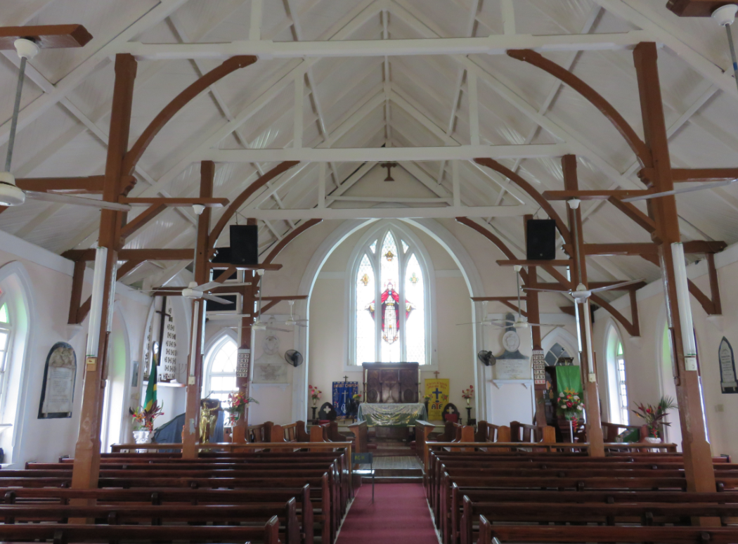 This church was under construction at the time of the disturbances. Consecrated by Bishop Reginald Courtenay 15 Sep 1874. Severely damaged by hurricane 18 August 1880. Again severely damaged by hurricane 17 Aug 1951. The Revd. S. H. Cooke, Rector at the time of the disturbances was not killed by the rioters, as some affirm. He died of dysentery in Kingston on 16 June 1875 and was buried in “Tamarind Tree” churchyard, near Old Harbour. The mortal remains of the Revd. John G. Richards (a former Rector) was interred in the Sanctuary of this church. The five old monuments mounted on the walls of this church, were taken from the old church” [adapted from a plaque on display within the church]